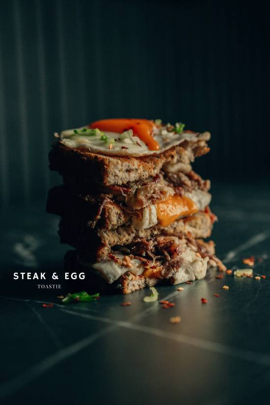 Ribeye Angus steak strips, fried egg and herbs, caramlised onions packed inside a seeded bloomer toastie, & topped with melted cheddar cheese and special sauce.